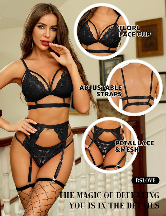 Sexy Lingerie for Women,3 Piece Lace Lingerie Set Bra and Panty Sets with Garter Belt Babydoll Teddy Lingerie